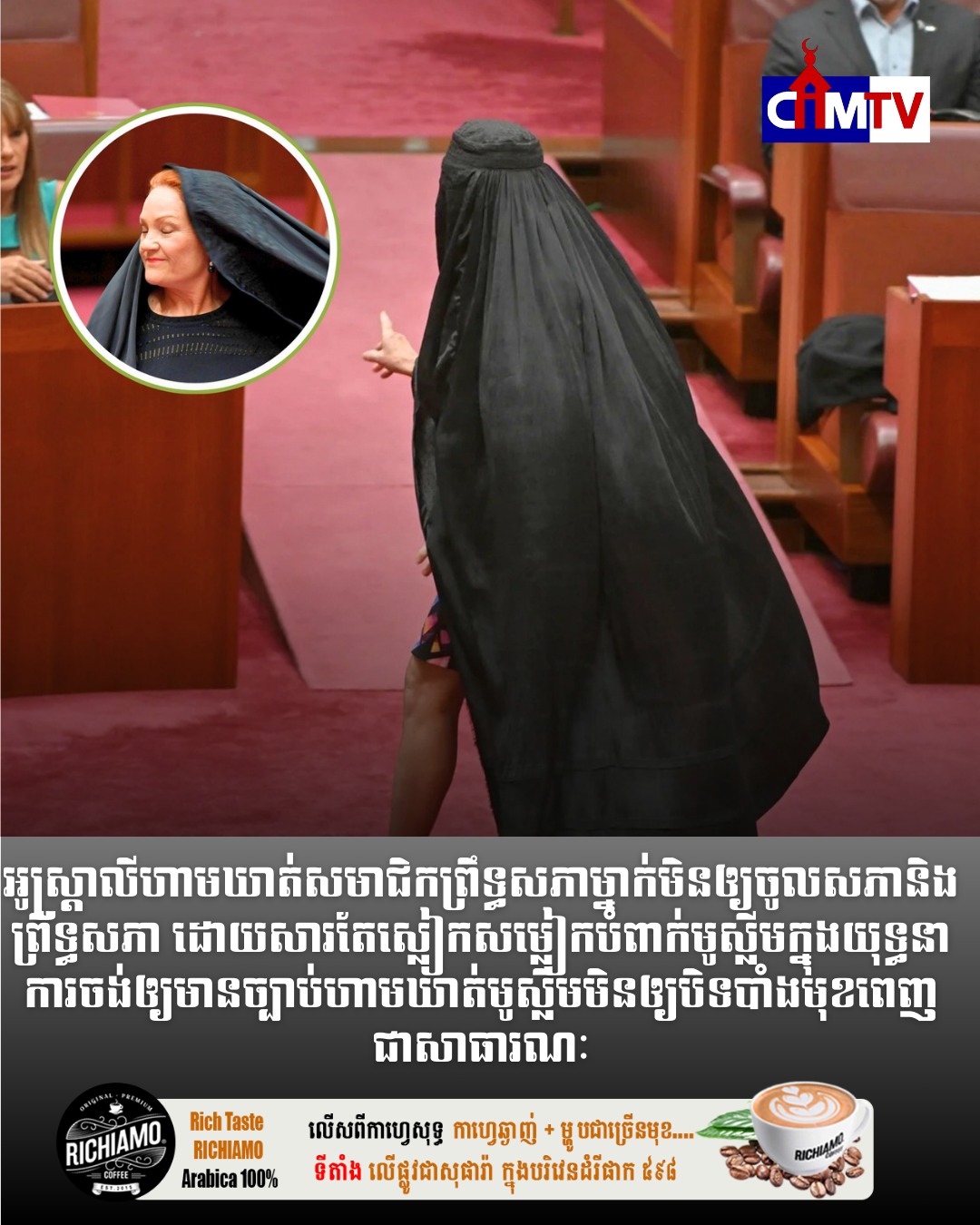 អូស្ត្រាលីហាមឃាត់សមាជិកព្រឹទ្ធសភាស្តាំនិយមម្នាក់មិនឲ្យចូលព្រឹទ្ធសភានិងសភា ដោយសារ តែស្លៀកសម្លៀកបំពាក់មូស្លីមនៅក្នុងព្រឹទ្ធសភាក្នុងយុទ្ធនាការចង់ឲ្យមានច្បាប់ហាមឃាត់មូស្លីមមិន បិទបាំងមុខពេញជាសារធារណៈ
